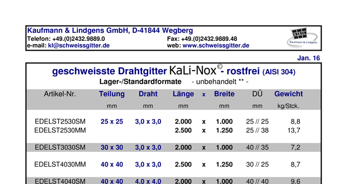 Welded wire mesh out of stainless steel (AISI 304) we store in various dimensions as well. Our stock range KaLi-Nox gives you an initial impression of shortest availability for your need; of course the order of single quantities is possible at any time as well.
