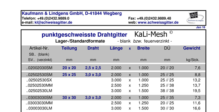 Our range of warehouse stock Standards KaLi-Mesh offers best solutions for a lot of different application. All standard panels are designed with open edges (over-hangs); different panel sizes minimalize your clippings. Delivery is 100% based on your need – we ship bundles of pallets as well as single items.